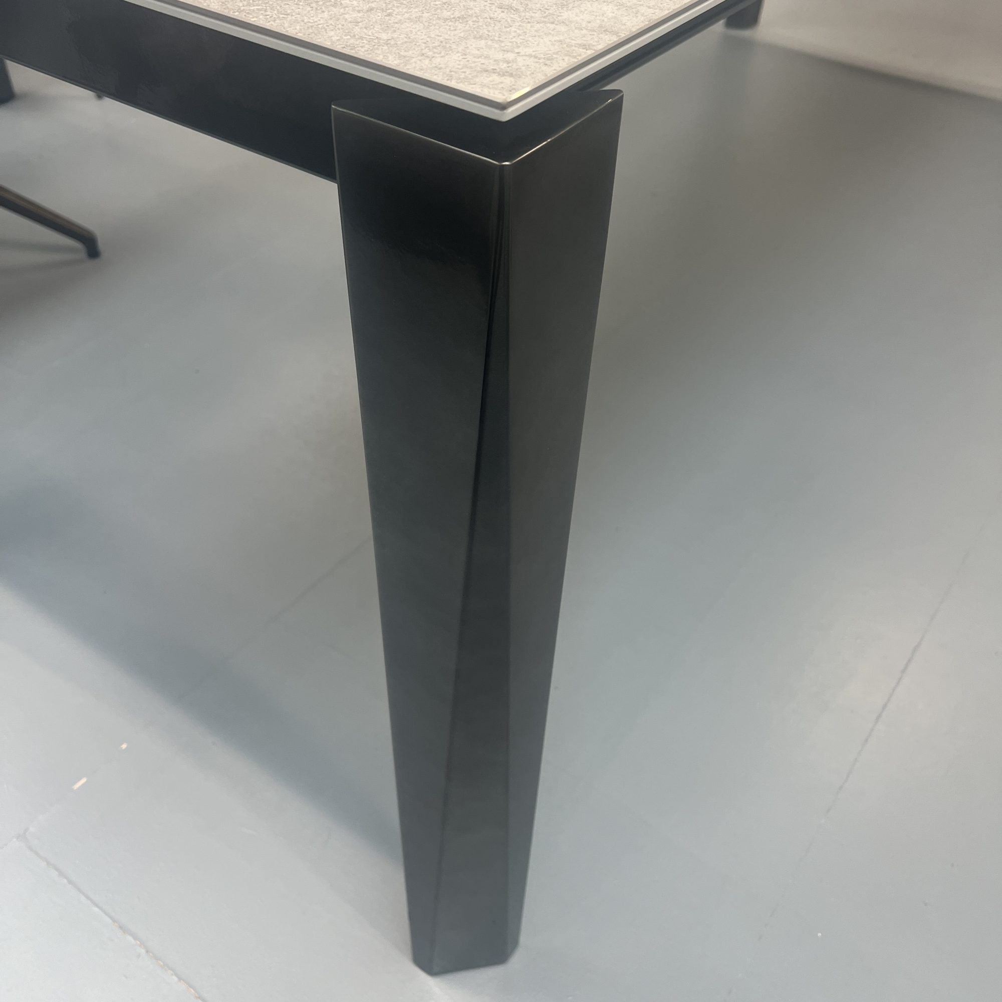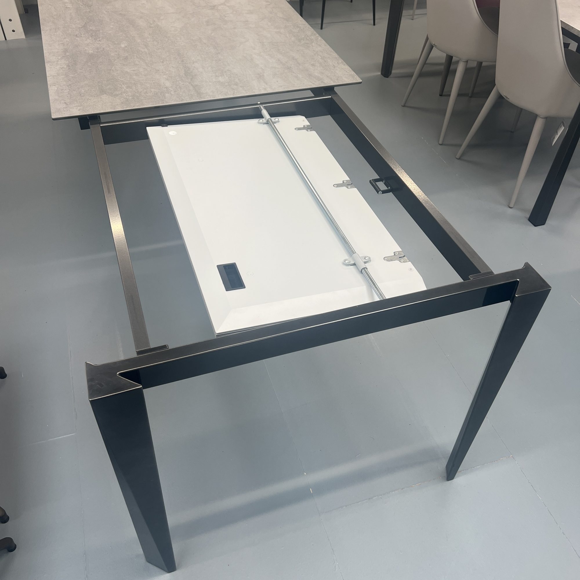 The Chef dining table features a sliding butterfly fold out extension that extends the table from 160cm to 240cm. With the wheels on the extending side legs, this is very easy to be done. Having a ceramic top on the table, removes the need for mats or coasters. Allowing you to see the top of the table all the time, without the need to cover it up.