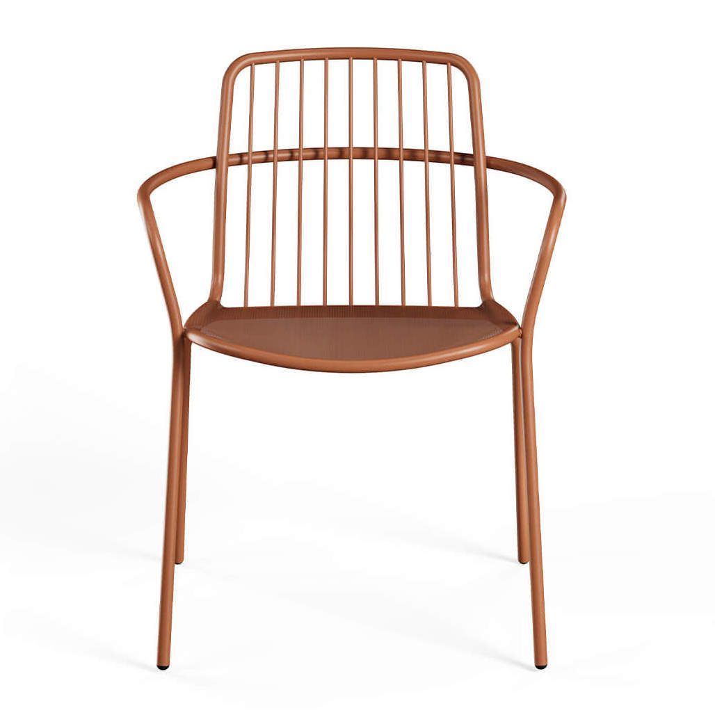 The Alisea steel armchair for outdoor use is a contract design solution engineered for urban furniture and high-traffic outdoor spaces. Ideal for bars, restaurants, patios, terraces, and public areas, it blends durability, functionality, and contemporary aesthetics. Inspired by the lightness of the wind, the Alisea armchair features a steel mesh seat that ensures breathability, comfort, and ease of maintenance - making it perfect for outdoor environments. The backrest, crafted from metal rods, provides a light and dynamic visual effect that enhances its surroundings. The design integrates two construction technologies - curved steel bars and steel mesh - guaranteeing structural solidity, durability, and weather resistance, even in high-use contract contexts. Available in a wide range of colors, the Alisea armchair easily adapts to modern, industrial, and contemporary styles, offering maximum design versatility for professional outdoor furnishing.