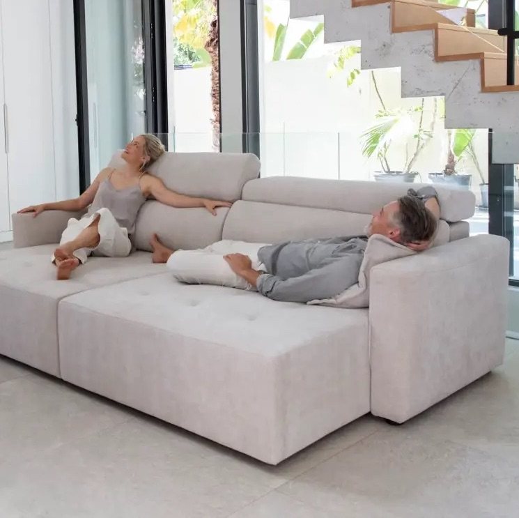 The comfortable back cushion is split in 2 (unlike the Paridis version) and features an integrated ratchet headrest, giving the sofa a low modern look, then being able to raise the back to give head and neck support.