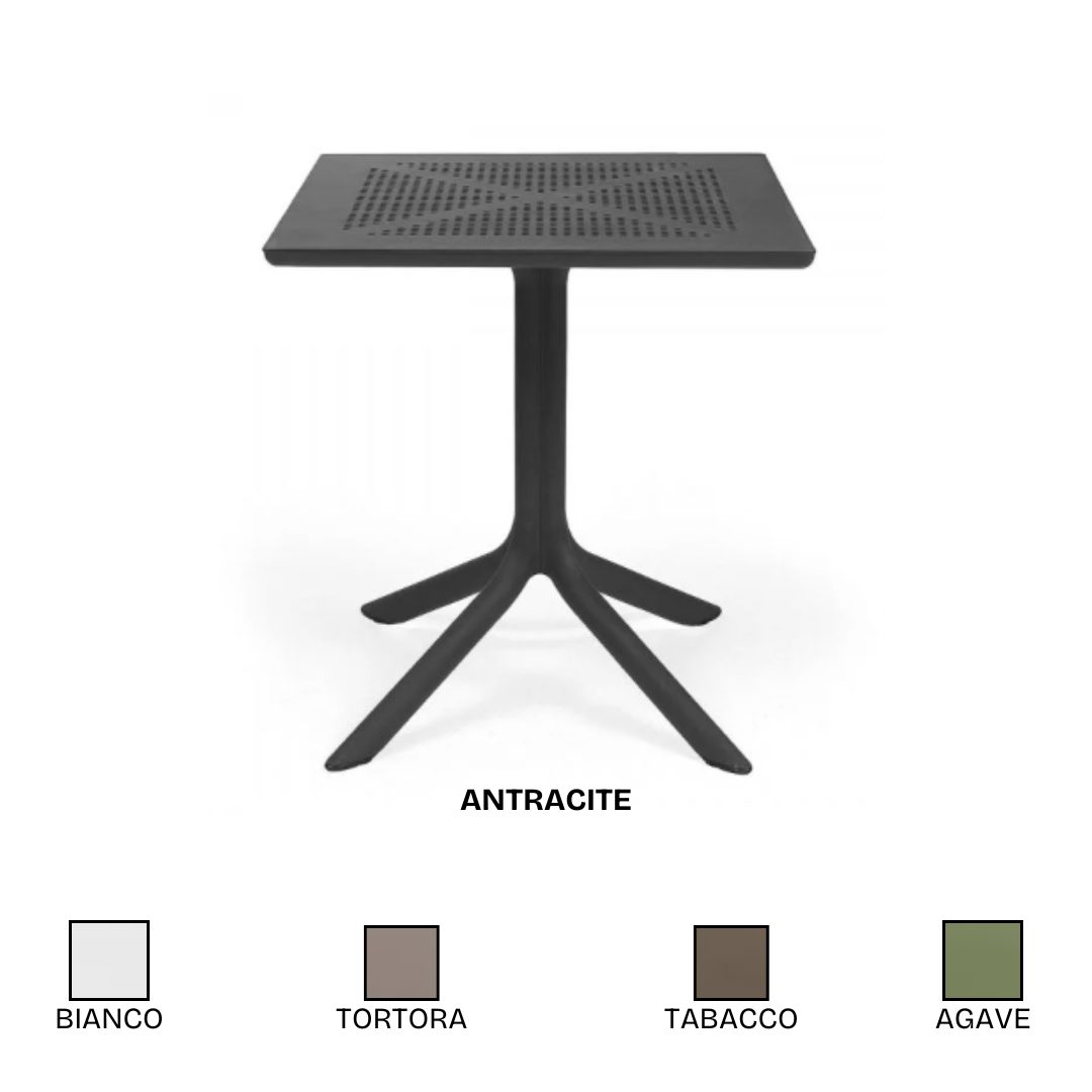 The Nardi Clip is a bistro square table is made with fibreglass resin with central support design and has a four spokes and DurelTop tabletop, photo-engraved with a round perforated pattern.